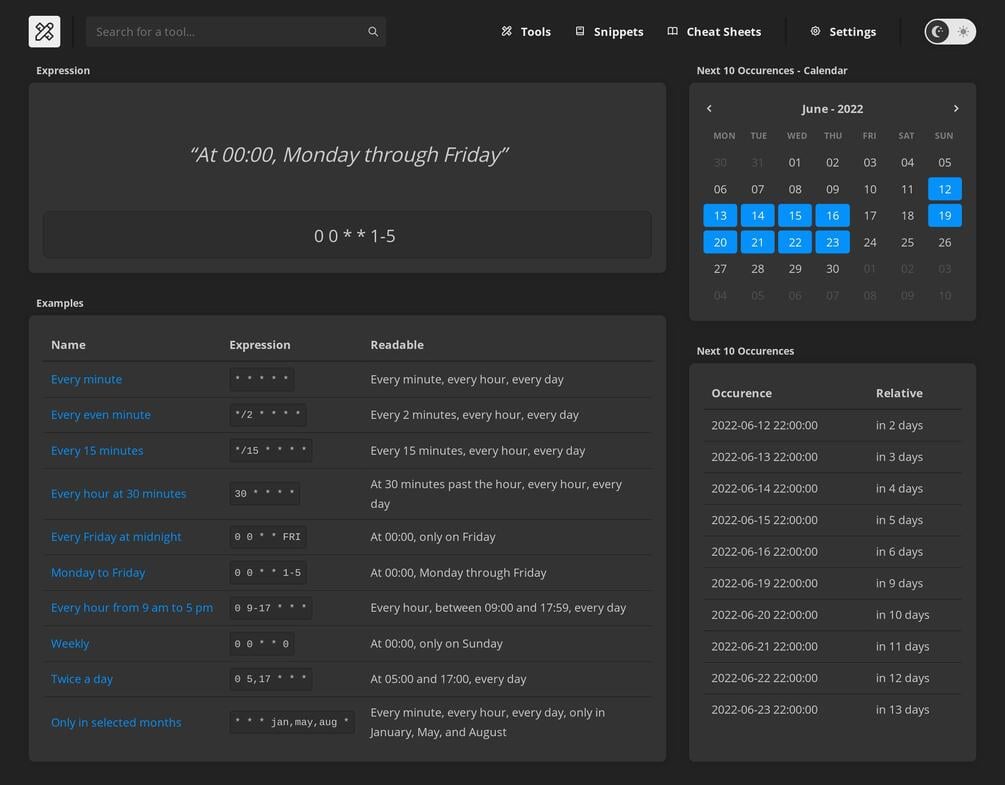 - CRON: Inspect CRON expressions in English, and its next occurrences as a list or a calendar.