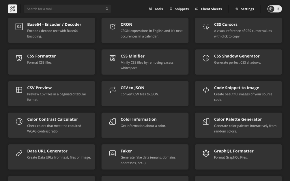DevBox (www.dev-box-app) is a collection of little utilities (93 and growing), cheat-sheets (20 and growing), snippets (65 and growing) and collections (20 and growing) that are useful during development.